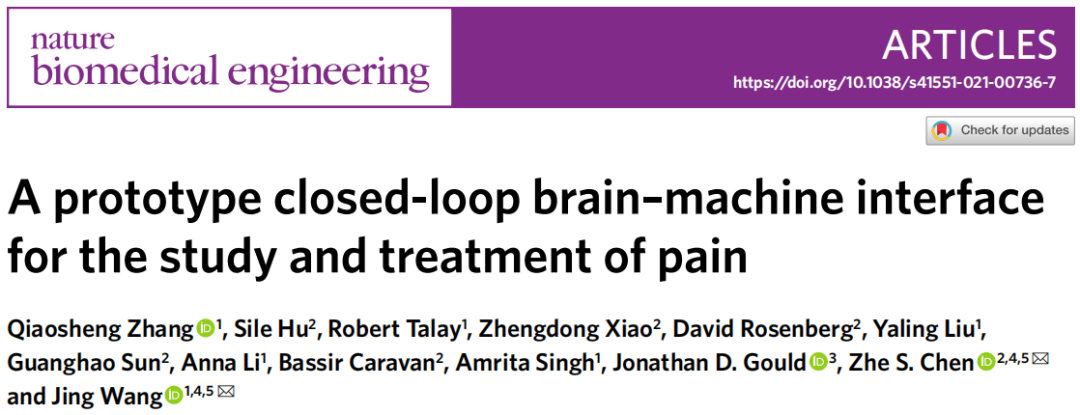 2021年6月份,紐約大學(xué)醫(yī)學(xué)院 Wang Jing 教授和陳哲教授作為共同通訊作者(第一作者為張巧生博士),在 Nature 子刊 Nature Biomedical Engineering 在線發(fā)表了題為:A prototype closed-loop brain–machine interface for the study and treatment of pain 的研究論文。